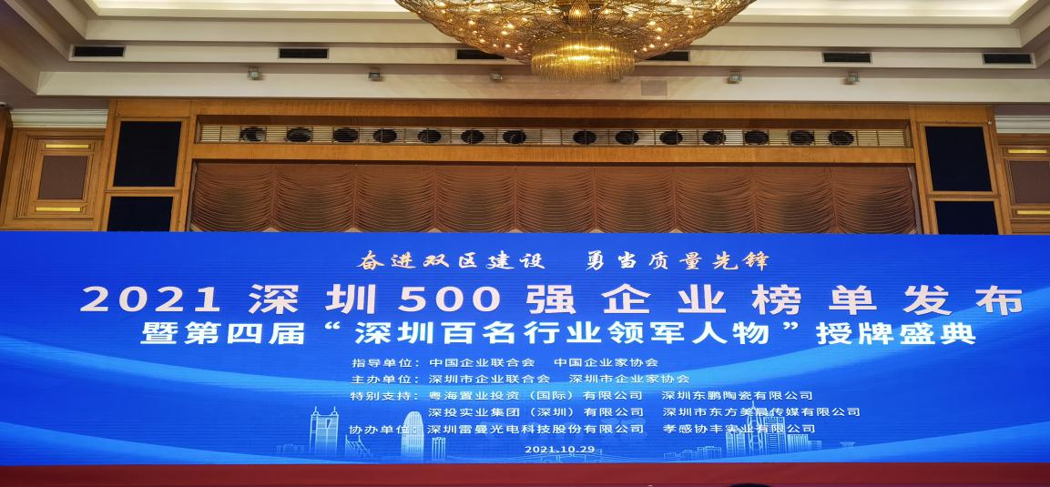 10月29日,由中國企業(yè)聯(lián)合會、中國企業(yè)家協(xié)會指導(dǎo),深圳市政府相關(guān)部門支持,深圳市企業(yè)聯(lián)合會、深圳市企業(yè)家協(xié)會等主辦的“奮進雙區(qū)建設(shè) 勇當(dāng)質(zhì)量先鋒”2021深圳500強企業(yè)發(fā)布暨第四屆“深圳百名行業(yè)領(lǐng)軍人物”頒獎盛典在深圳五洲賓館隆重舉行。